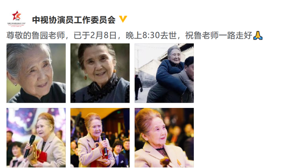 2月12日,@中视协演员工作委员会 发布微博称:“尊敬的鲁园老师,已于2月8日,晚上8:30去世,祝鲁老师一路走好”。鲁园从艺70年,曾主演过《守望幸福》《情满四合院》等剧。