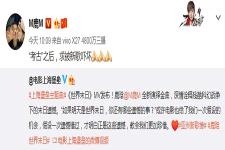 近日,鹿晗为自个主演的新片《上海堡垒》中所演唱的主题曲就是翻唱自周杰伦的《世界末日》,在6号的时候也正式上线,鹿晗迫不及待在自己的社交平台上晒出了MV,并cue了下周杰伦,求周杰伦能赶紧发布新歌。原来在5号的时候,周杰伦就曾在线回复了粉丝们的催歌,表示“新歌要来了,不要吓坏!”