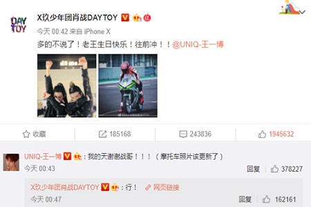 肖战只能甚是无奈地回应王一博弟弟,说是假的。可随后却是直接在微博上晒出了两人的合照,还有王一博骑摩托车的合照,送祝福。
