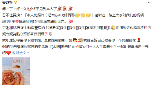 7月18号安以轩公布产子喜讯,微博晒出孩子的小脚丫照片,还勾着父母两人的戒指,看得出是精心摆拍的,想要纪念这个重要的时刻。她在17年三月的时候宣布了结婚的消息,之后6月份就举办了婚礼,到了19年3月份的时候宣布了怀孕的好消息,没想到这么快就迎来了小宝宝的降生。而她发文还感谢了自己的老公,让不少人想起安以轩老公陈荣炼的资料背景,担任多家公司董事长,身价过亿的他可谓财力雄厚,当然了,更重要的是对妻子很好。