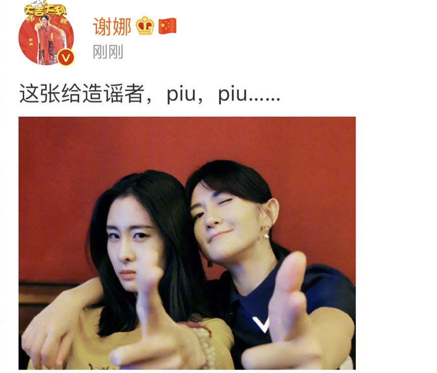 后来,谢娜本人也看不下去,在8月13日下午谢娜又单独晒出一张与张碧晨的合照力破传言。照片中,谢娜将手搭在张碧晨的肩上,两人比出手枪的手势。并配文:“这张给造谣者,piu,piu…… ”直接亲自辟谣此前的插足婚姻传闻。没过几分钟后又在微博单独发了一条微博对老公张杰隔空表白,“做你的小歌迷,我很快乐。”照片中的娜姐绑着星星的发绳带着星星的耳环在他的舞台下做一个闪亮的星星,果然是爱情最好的模样了。