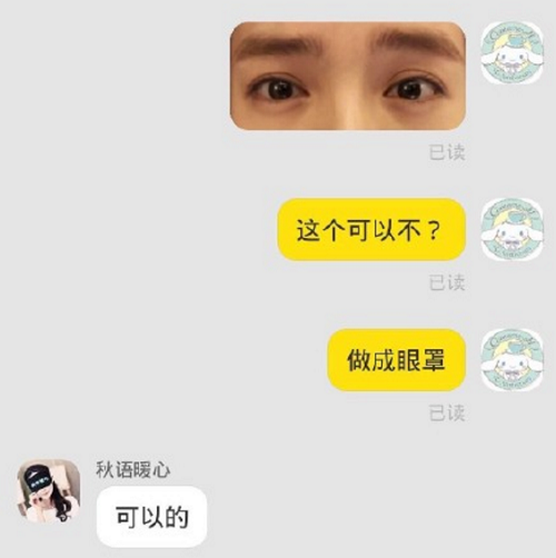 现在套熬某宝上的功能可以说是什么都有了,所以近日有位网友就想要在上面买个可以印上鹿晗图片的眼罩款式。从这个聊天截图我们可以看到这姑娘发给卖家的图片是眼部的截图照片,而对方也表示这个款式是可以做好的。这时候姑娘可能还美滋滋的想着等到时候拿到眼罩看到自己爱豆明亮的眼睛简直美滋滋,但是现实的买家秀和卖家秀显然给了她沉重一击。她将自己受到的物品晒出来之后遭到了无数网友的嘲笑,简直成为今日粉丝们的快乐源泉了。