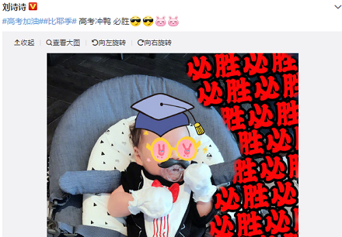 大家想必都知道这两天是刚打高三学子要检测自己学习成果的日子了,往常这个时候都会有不少艺人为他们送上自己的祝福,今年已经当上妈妈的刘诗诗也是这样。不同的是往常朴实的祝福在今年的小狮子的加持下显然更加让人兴奋了,虽然这次的正面照她用了一些贴纸把宝宝的一些五官遮挡住了,但不少人还是觉得十分的可爱的,毕竟就爸妈的长相来说,孩子也会有个良好的外貌基因的。