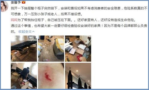 从张馨予晒出的照片可以看出这个柜子体积是很大的,只是没想到她在打开一个抽屉的时候整个柜子就这么砸了下来,她的妈妈为了保护她被砸中了背部。值得庆幸的是当时家中有人及时的来帮忙,然后伤势也不会危机到生命。她发微博也是为了告诉大家以后在家具安装验收的时候一定要检查仔细,毕竟家里要是有老人和小孩像这样被砸中的话那就是噩耗了,所以要多加注意这方面的安全。