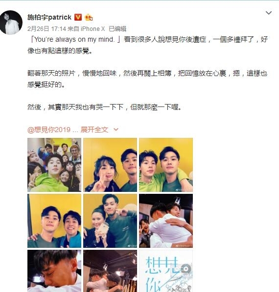 2月27日,施柏宇在微博晒出《想见你》剧组的九宫格照片,并感慨发文:“ You’re always on my mind. 看到很多人说想见你后遗症,一个多礼拜了,好像也有点这样的感觉。翻着那天的照片,慢慢地回味,然后再关上相簿,把回忆放在心里,嗯,这样也感觉挺好的。然后,其实那天我也有哭一下下,但就那么一下喔。”